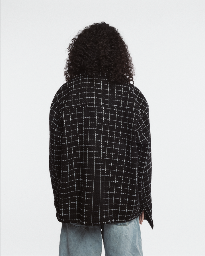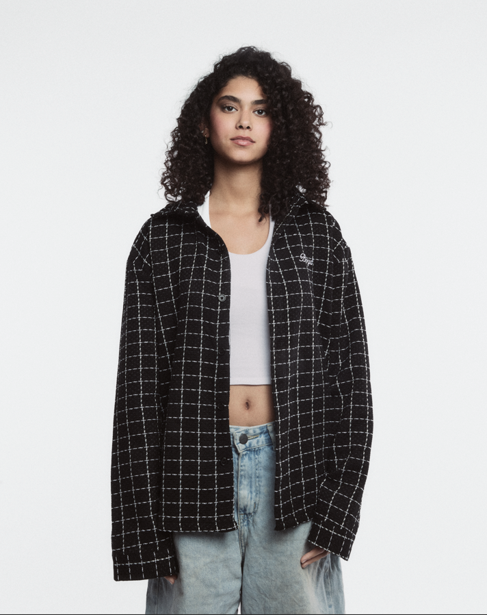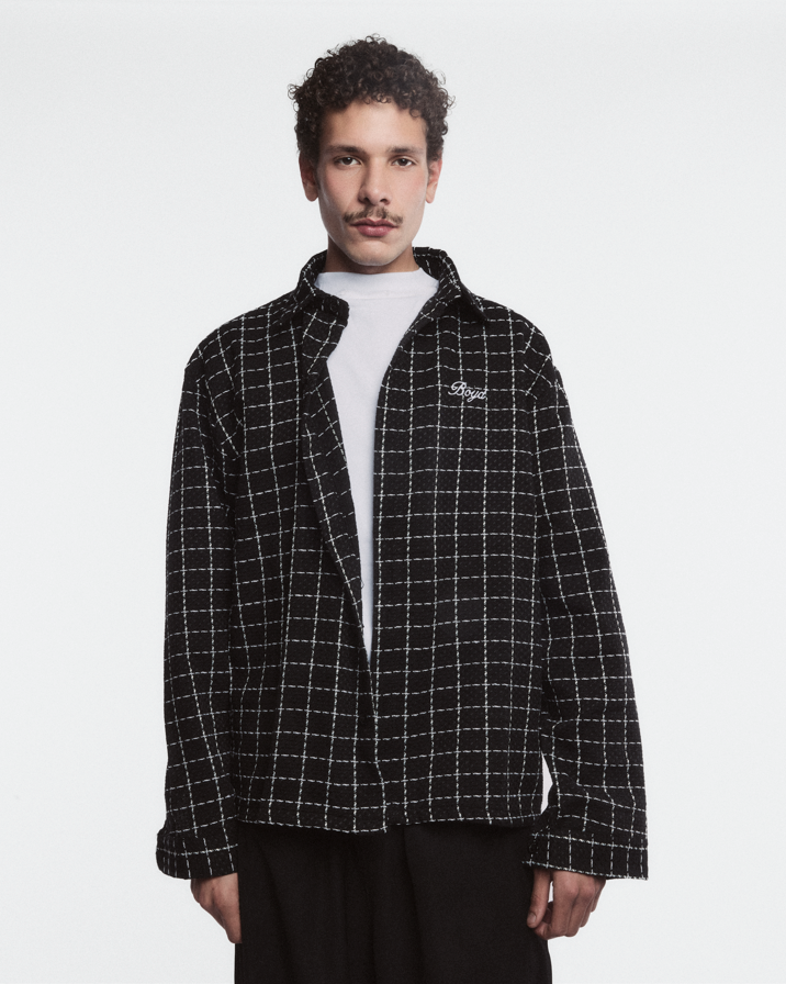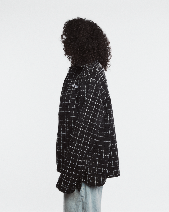 BOYD Grid Flannel in black with crisp white check pattern. Features embroidered Boyd script on the chest and a structured fit that works as a standalone piece or layering essential. Soft mid-weight fabric maintains its shape while remaining lightweight and comfortable for everyday wear.