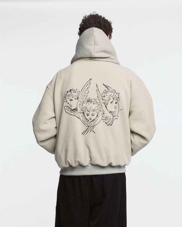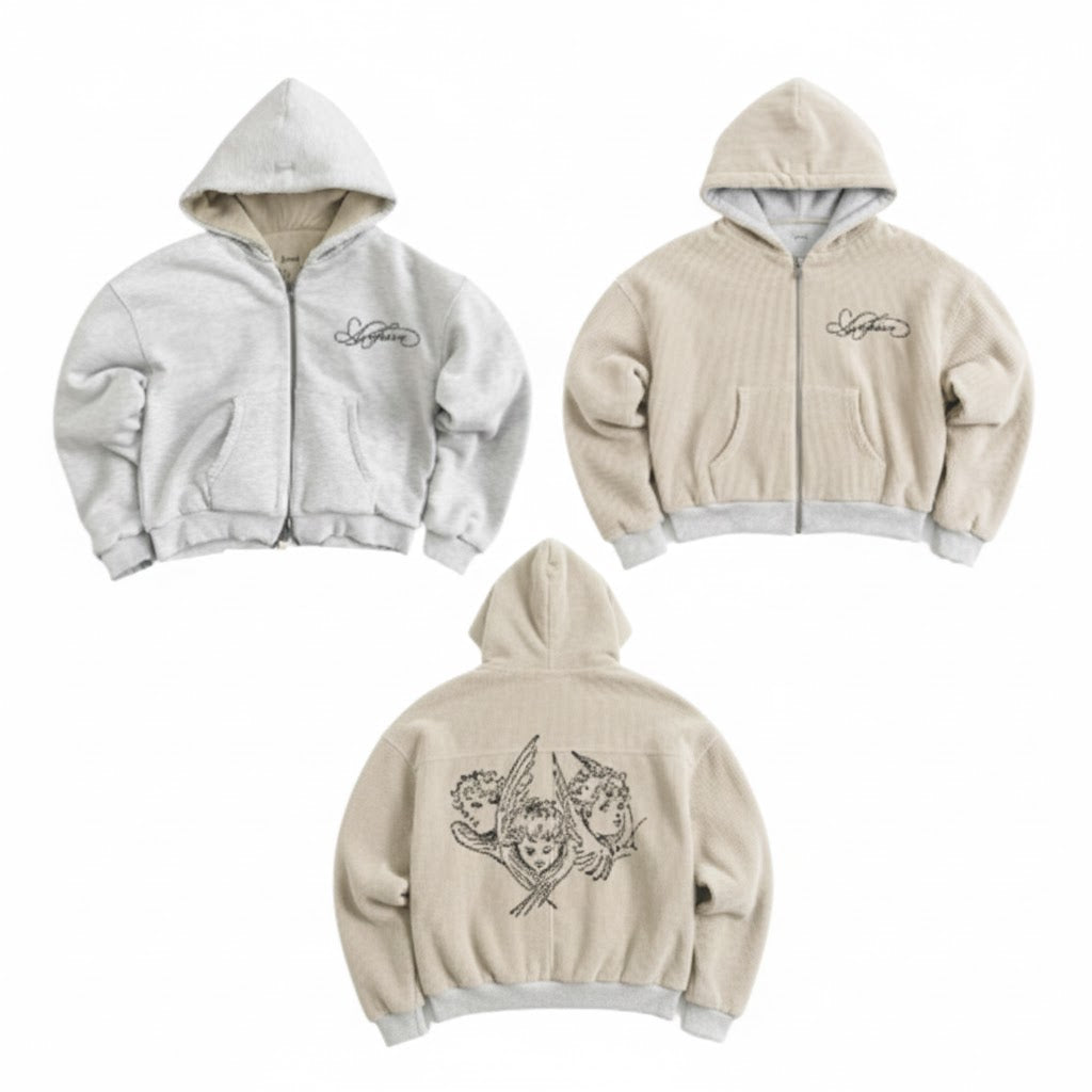 A reversible jacket offering two distinct looks in one piece. Built with substantial 2KG fabric for reliable winter warmth, it features a dual-face zipper for effortless style switching. Premium chest embroidery and back silk screen printing add refined detail. The relaxed, oversized cut delivers contemporary appeal while maintaining practical functionality for cold weather.
