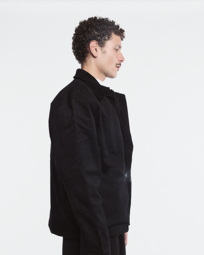 The DRAG Worker Jacket combines durable heavyweight cotton canvas with a cropped, oversized silhouette for contemporary workwear style. Features include a textured corduroy collar, industrial-grade front zip, and spacious patch pockets for practical everyday wear.