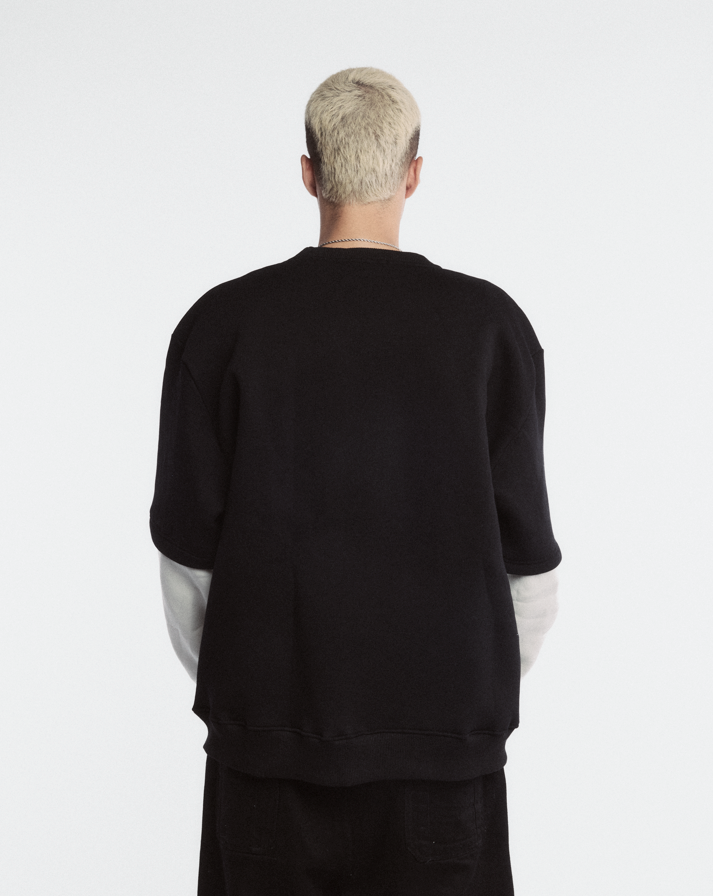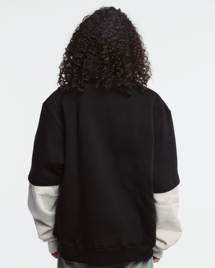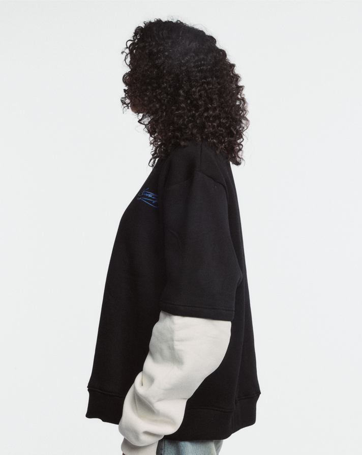 Heavyweight crewneck crafted from premium cotton with striking contrast layered sleeves—black body paired with crisp white arms. Features the iconic Boyd script graphic on the chest in electric blue. Built for a structured fit with a soft interior, this piece combines durability with understated streetwear sophistication.