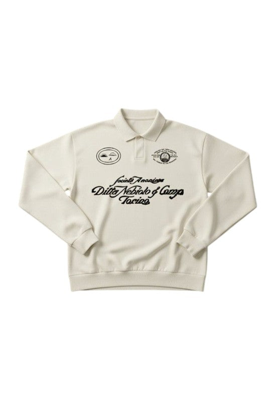 A stylish white long-sleeve polo with bold black graphics and a classic collared design. Made from soft, comfy fabric, it’s perfect for both casual and semi-formal looks—a standout piece for any wardrobe.
