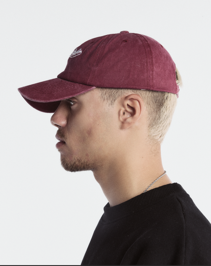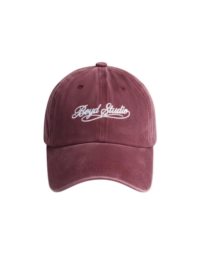 Red Washed Boyd Studio Cap in premium cotton twill with a soft, vintage-worn aesthetic. Features bold golden-yellow "Boyd Studio" embroidery on the front, unstructured 6-panel silhouette, and pre-curved visor for effortless style. Ventilation eyelets ensure breathability. Perfect for adding understated streetwear appeal to any outfit.